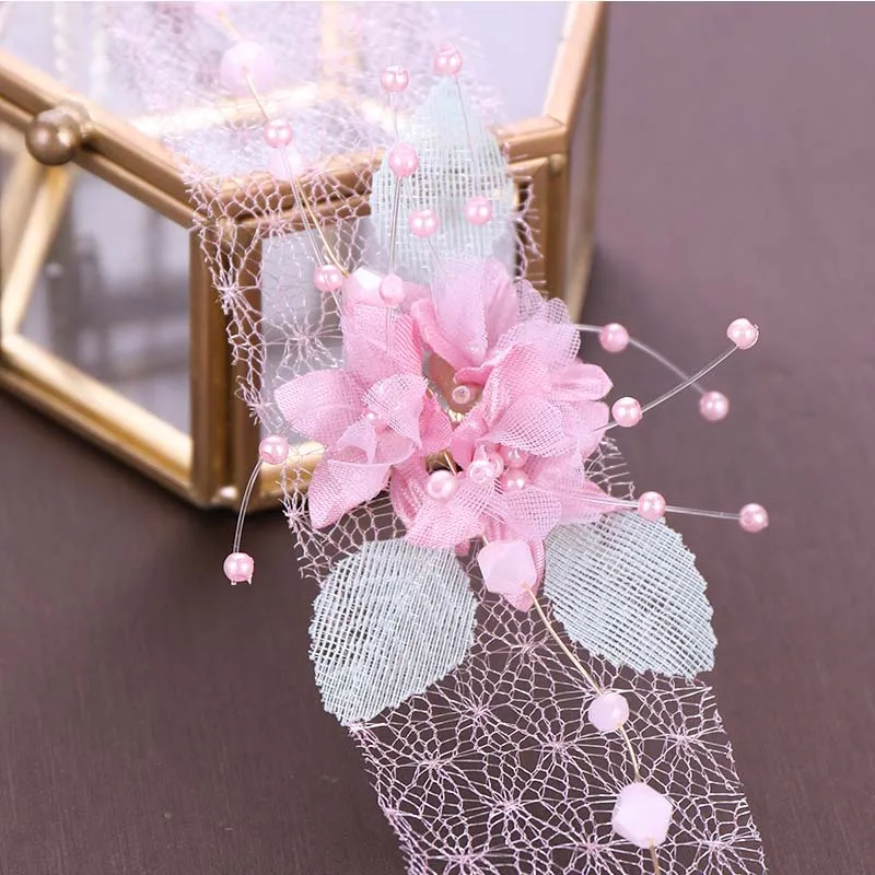 BEST SELLER Korean Sweet Pink Flower Women Hairband Long Tassel Earrings Set Lace Necklace Tiaras Bride Wedding